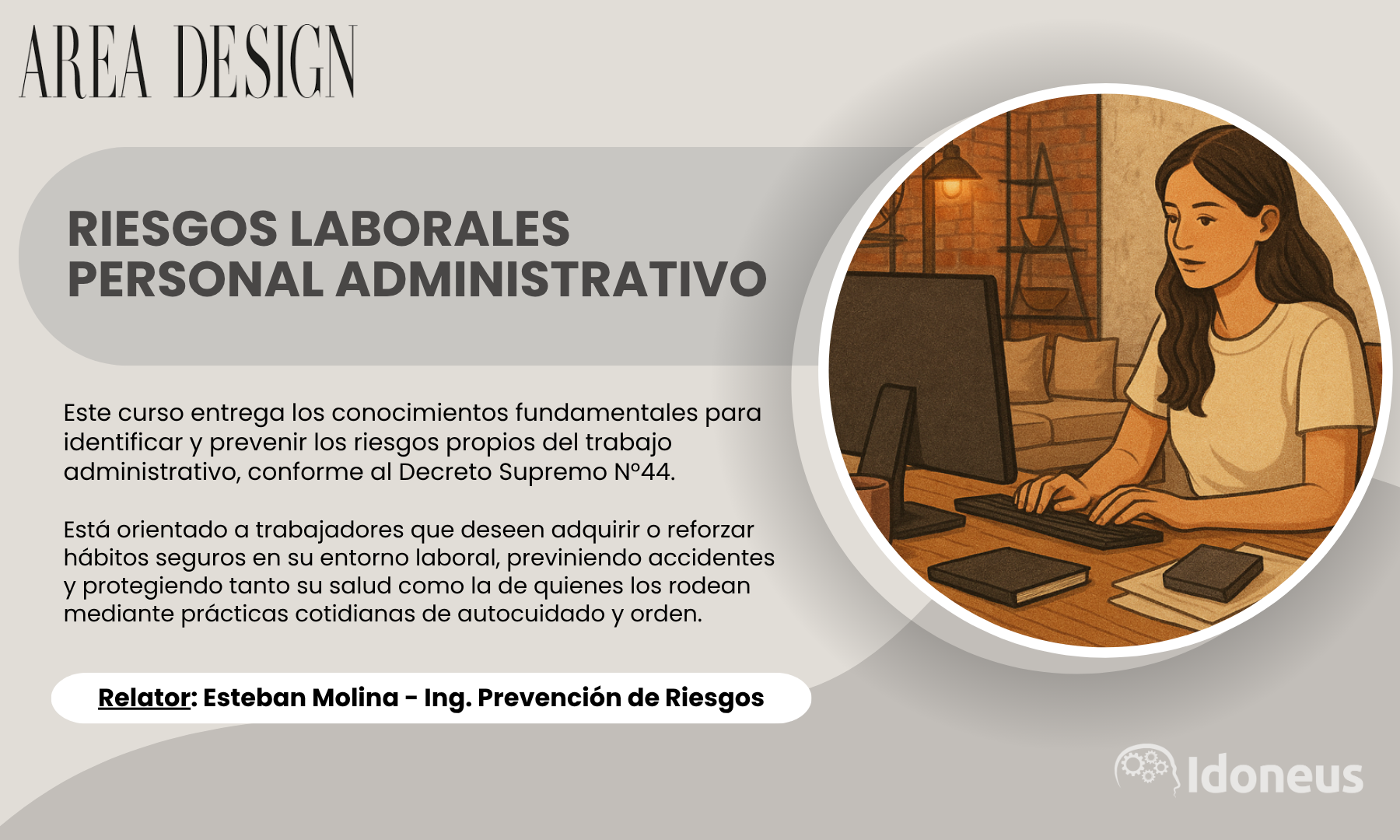 Este curso está orientado a reconocer y prevenir los principales riesgos a los que se expone una persona en tareas administrativas, conforme a lo establecido en la Ley 16.744 y el Decreto Supremo N°44 del Ministerio del Trabajo. Se abordan riesgos físicos, como caídas de mismo nivel, golpes contra objetos, choque eléctrico, caída de materiales, quemaduras por líquidos calientes y emergencias como incendios, sismos o quedar atrapado en un ascensor. También se incluyen los riesgos ergonómicos, asociados a malas posturas y movimientos repetitivos, y los riesgos psicosociales, como el estrés, la sobrecarga laboral y la violencia o acoso en el trabajo. El objetivo es generar conciencia y entregar herramientas prácticas para que cada persona identifique situaciones peligrosas y las evite mediante pequeñas acciones cotidianas.