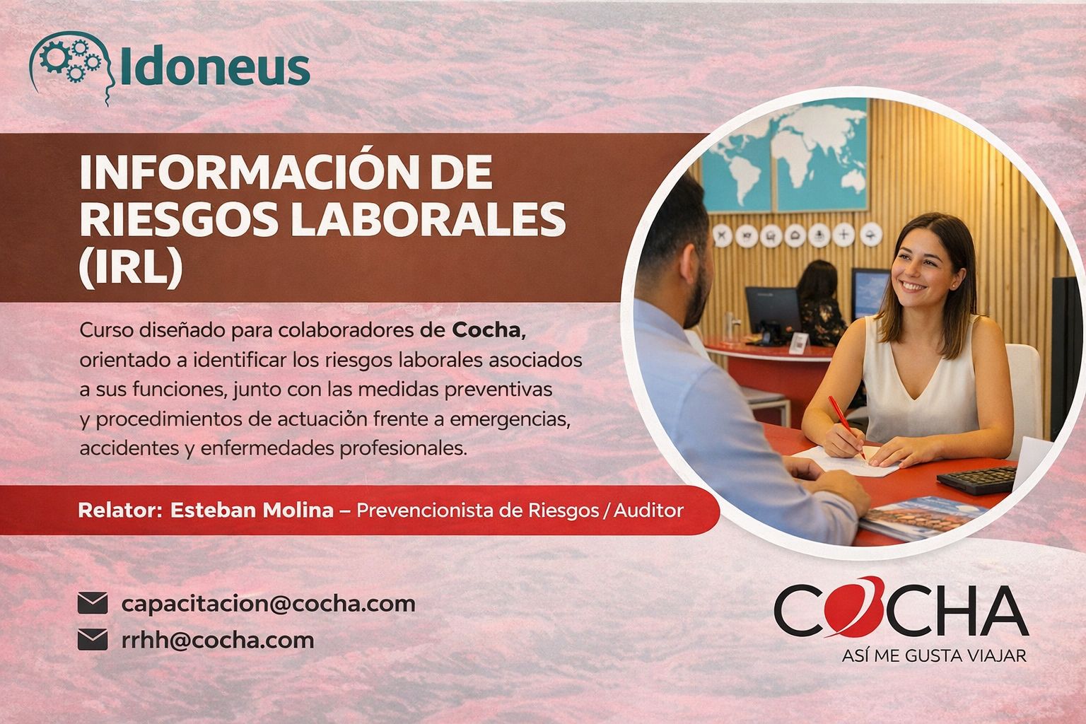 Este curso de Información de Riesgos Laborales (IRL) tiene como objetivo entregar a los colaboradores conocimientos básicos sobre los riesgos asociados a sus funciones y las medidas preventivas correspondientes.