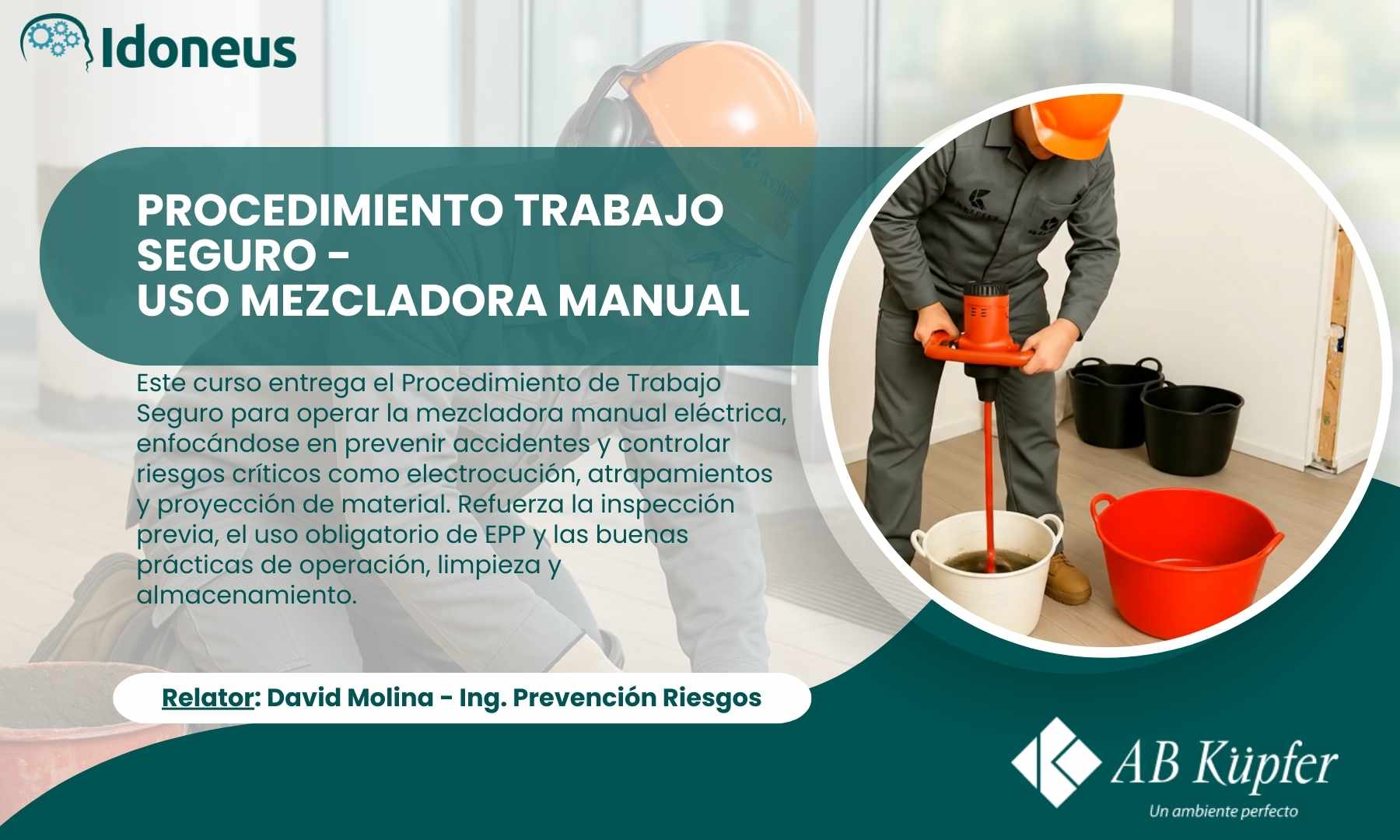 Este curso entrega el Procedimiento de Trabajo Seguro (PTS) para el uso de la mezcladora manual eléctrica, enfocándose en la prevención de accidentes y el control de riesgos críticos. Aborda los peligros principales asociados a la herramienta, como electrocución, atrapamiento, proyección de material, sobreesfuerzos y cortes. Refuerza la inspección previa del equipo, el uso obligatorio de EPP y las condiciones seguras de conexión y operación. Incluye buenas prácticas de limpieza, almacenamiento y mantenimiento preventivo para prolongar la vida útil del equipo. Además, incorpora acciones claras ante fallas y protocolos de respuesta frente a emergencias.